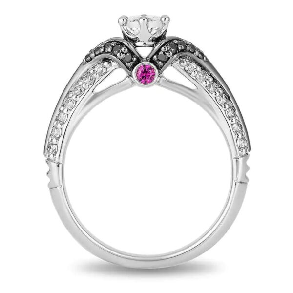 - Chevron-shaped black rhodium-plated collars highlight the center stone with black diamonds.