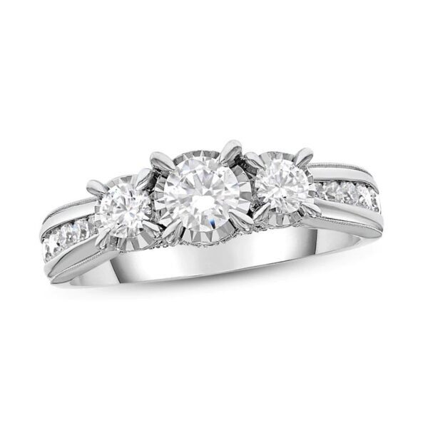 Classic and chic, this beautiful 3-stone diamond engagement ring features a beautiful round diamond at its center. Additional round diamonds beam down the side of the band, giving the ring a total diamond weight of 1 carat. Fashioned in 10K white gold, the ring is featured in the Now & Forever bridal collection.