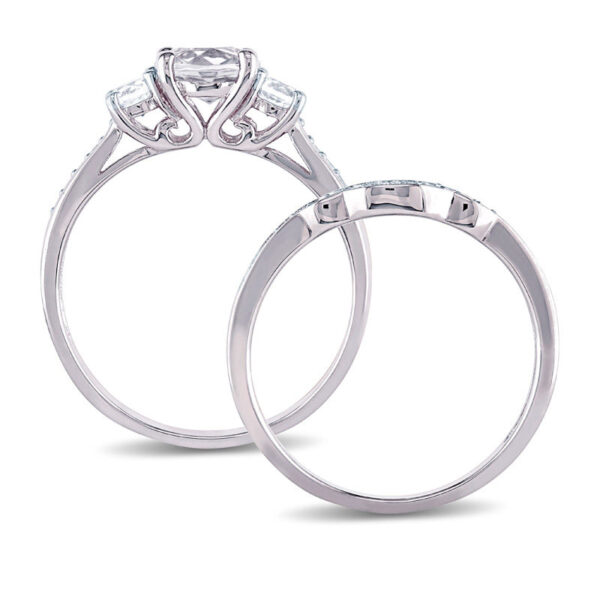 Simply stunning, this glistening bridal set is a beautiful beginning to the rest of your lives together. Shimmering in cool 10K white gold, the engagement ring features a dazzling 6.0mm white sapphire flanked by a pair of smaller created sapphires. Sparkling pav??-set diamonds adorn each side of the tapered shank for a look she can’t help but admire. On your special day, a coordinating contoured diamond-lined wedding band completes this significant expression of your love. Radiant with 1/8 ct. t.w. of diamonds and a brilliant buffed luster, this bridal set is everything she imagined and more.