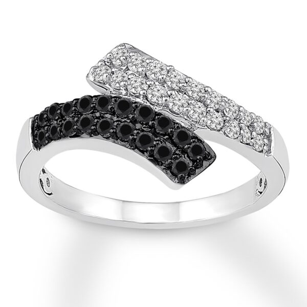 This exciting ring for her features a bypass design decorated with round black and white diamonds. The sterling silver ring has a total diamond weight of 1/2 carat. Black diamonds are treated to permanently create the intense black color.