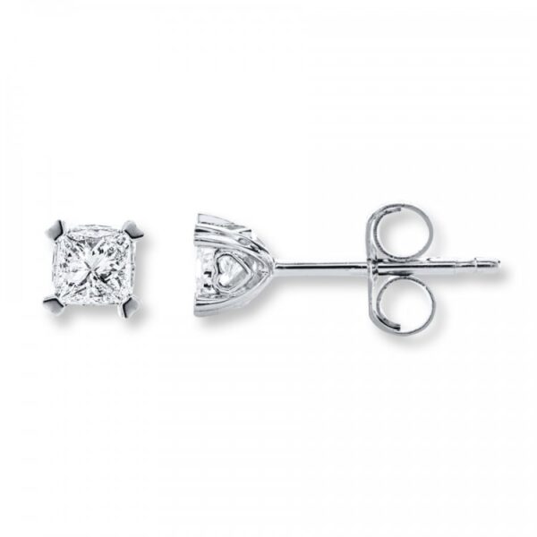 A perfect gift for any occasion, these solitaire earrings for her each shimmer with a princess-cut diamond. Totaling 1/2 carat in diamond weight, the earrings are fashioned in 14K white gold. Friction backs keep the earrings secured.