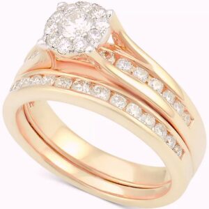 Engagement ring embraces the modern beauty of the halo design. The brilliant 1-carat oval-shaped diamond center reflects passion for vintage designs, while round diamonds add sparkle to the split-shank band. The diamonds total 1 3/4 carats in weight.