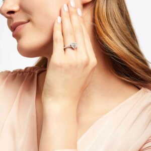 Take their breath away with the romantic sparkle in this magnificent engagement ring from the Neil Lane Bridal? collection. An endearing heart-cut diamond radiates from the center when sweetly embraced by a halo of bright round-cut diamonds. The lovely center is perfectly perched amidst its classic band traced with brilliant round diamonds. Crafted in iconic 14K white gold, the ring has a total diamond weight of 1 3/8 carats.
