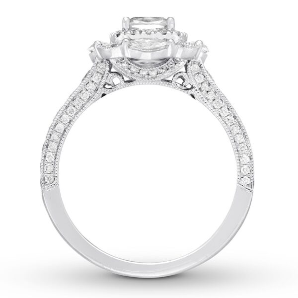 Combining vintage-inspired design with modern details, this remarkable engagement ring from displays a 3/4-carat cushion-cut diamond center framed in round diamonds. Marquise diamonds pair with duets of round diamonds to create the sparkling outer frame. Delicate milgrain and shimmering diamonds adorn the band to complement. Fashioned in polished 14K white gold, the ring has a total diamond weight of 1 5/8 carats.