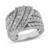 This ornate and breathtaking diamond ring features crossed rows of brilliant 10K white gold deeply embellished with all sizes of sparkling round diamonds. Sure to steal the spotlight, this fashionable ring has a total diamond weight of 2 carats.