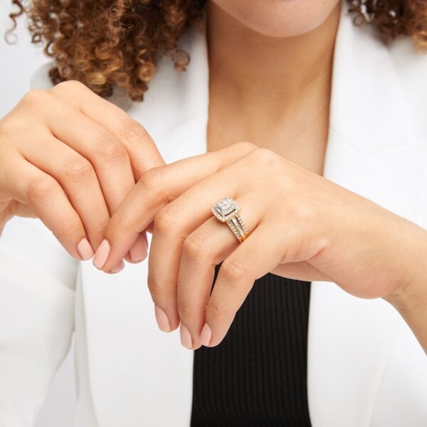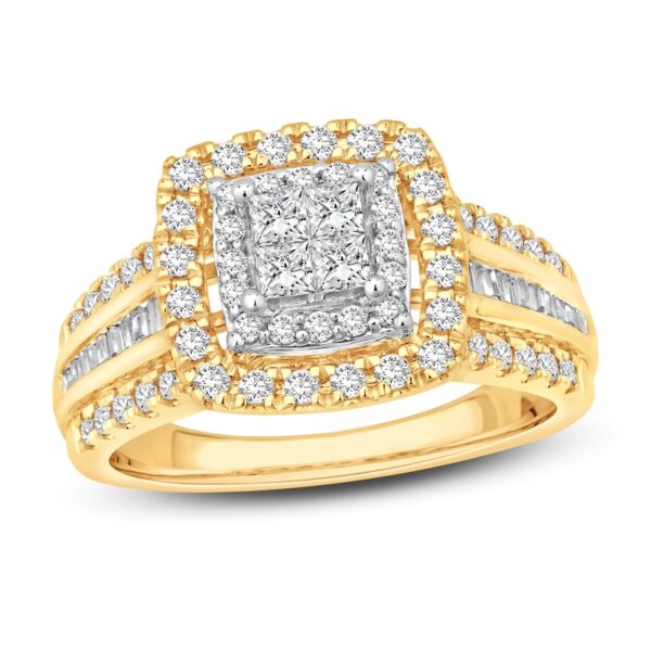 This gorgeous two-tone engagement ring showcases four stunning princess-cut diamonds at its center, set in iconic 14K white gold. Brilliant round diamonds halo the center diamonds, and another frame of round diamonds set in 14K yellow gold brings a beautiful contrast. The band sparkles with round and baguette-cut diamonds, giving the ring a total diamond weight of 1 carat.