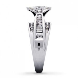 One and one-half carats of diamonds sparkle in this beautiful diamond ring crafted of high-polish 14K white gold. The center marquise diamond is near-colorless and surrounded by rows of channel-set round and baguette diamonds. Available online while supplies last. Previously Owned Treasures are not eligible for in-store pick-up. Previously Owned Treasures may only be shipped either to your home address or to an alternate address.