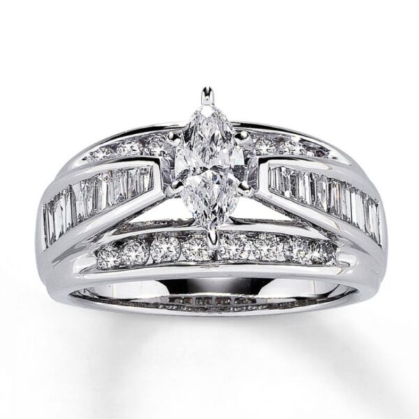 One and one-half carats of diamonds sparkle in this beautiful diamond ring crafted of high-polish 14K white gold. The center marquise diamond is near-colorless and surrounded by rows of channel-set round and baguette diamonds. Available online while supplies last. Previously Owned Treasures are not eligible for in-store pick-up. Previously Owned Treasures may only be shipped either to your home address or to an alternate address.
